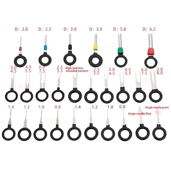 Përfshin ekstraktorë të pinëve të vetme dhe të dyfishta dhe vegla të fuzionuara të madhësive të ndryshme për të garantuar përputhshmërinë me një gamë të gjerë konektorësh, si në automjete ashtu edhe në pajisje elektronike.
